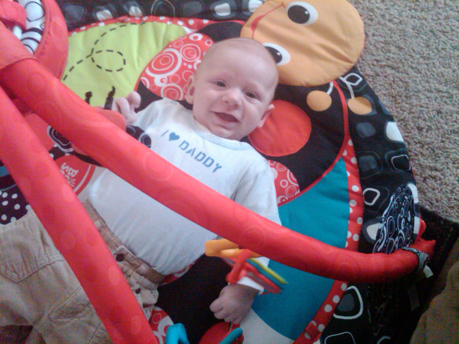We brought him a little playmat, and he LOVES it. I had one for Ethan when he was little, and he didn't like it at all, so I sold it. Jacob is the complete opposite. He loves watching the lights, and trying to reach the toys. 3/7/11